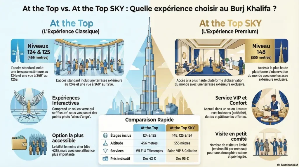 Entre At the Top (124–125) et At the Top SKY (148), l’hésitation est normale : on parle du même bâtiment, mais pas du même ressenti.